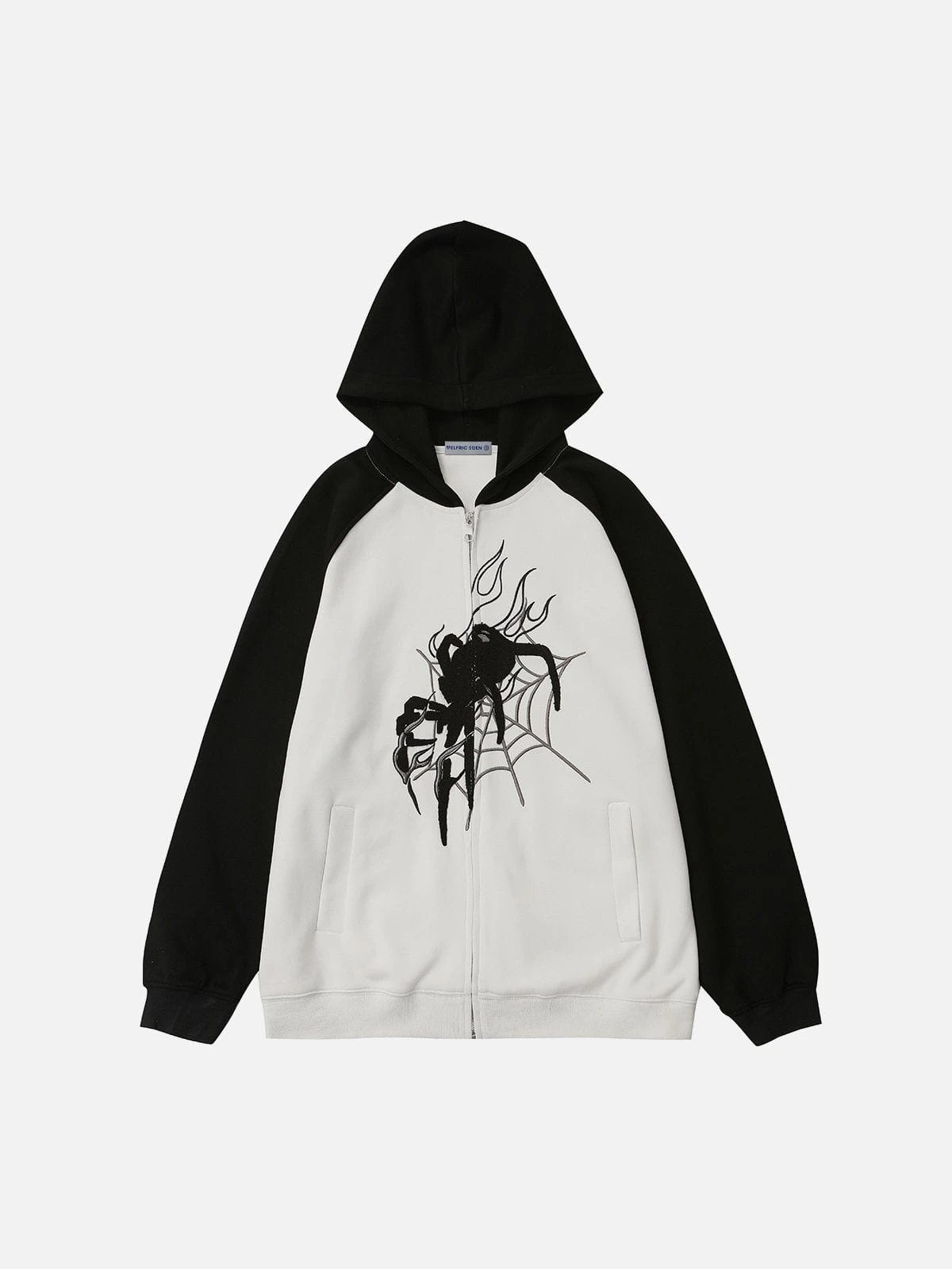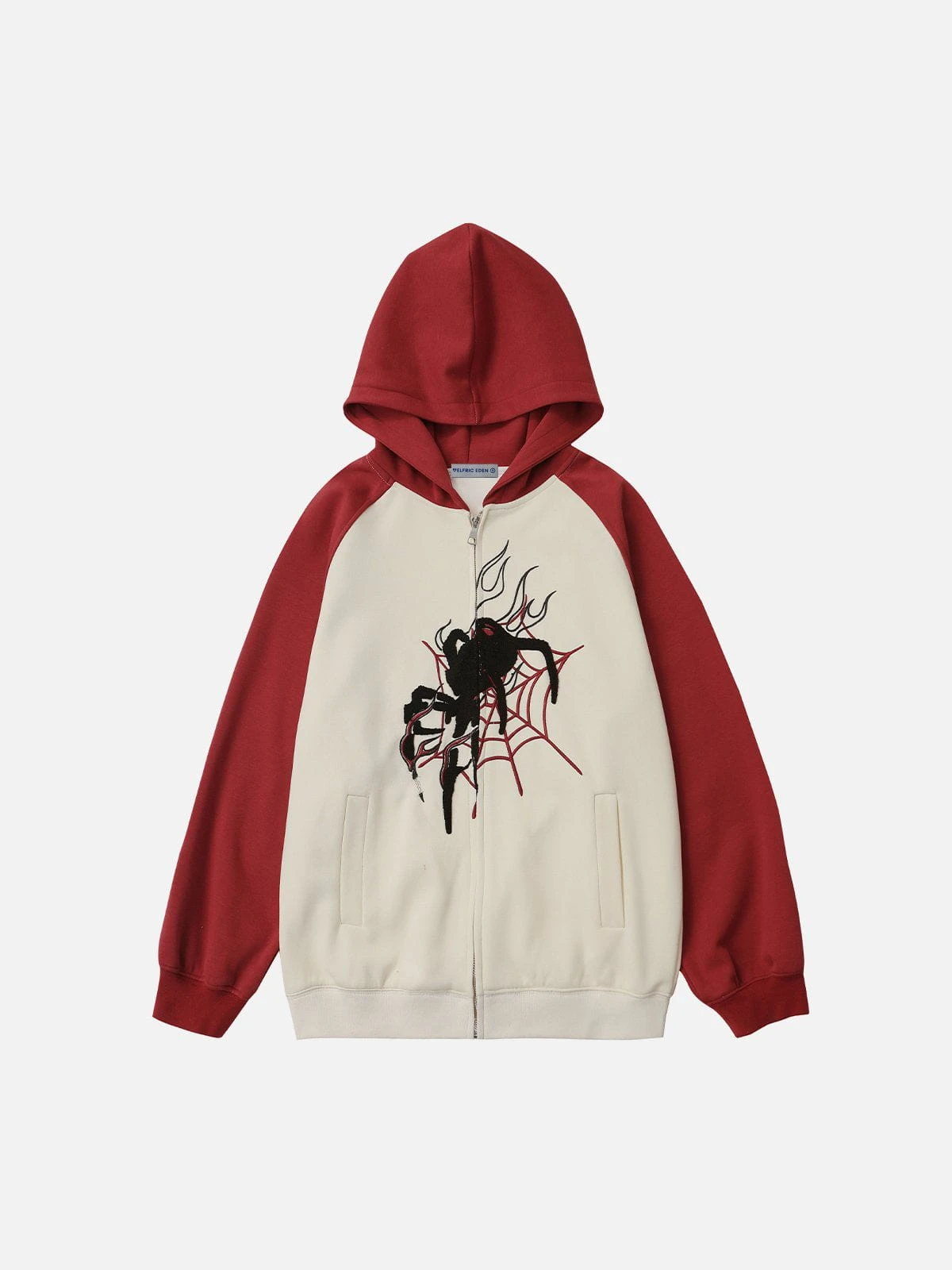 The distinctive dropped-shoulder sleeves add a modern edge, while the standout feature is the captivating spider motif gracefully entwined in a fiery web. The front zipper not only adds an urban flair but also offers versatility in styling – zip it up for a sleek look or leave it partially open for a more relaxed vibe.
