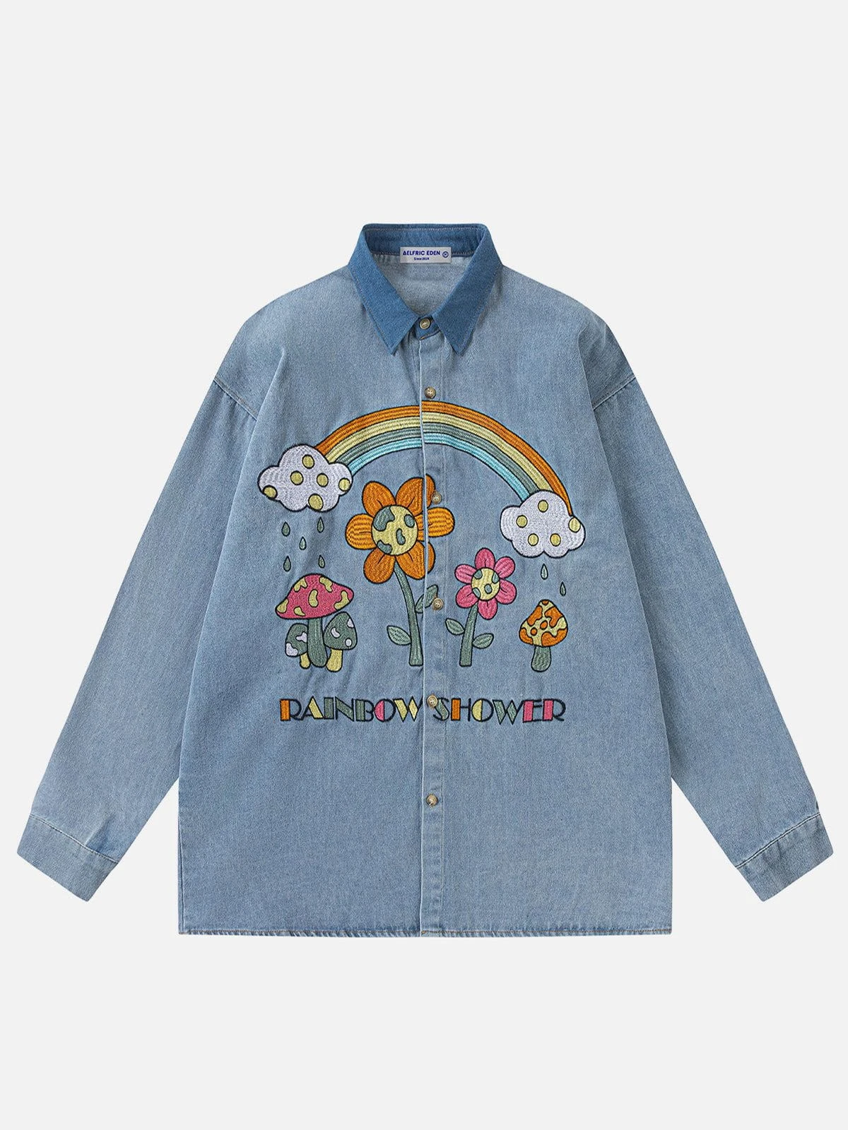Featuring a unique denim-on-denim combo and an embroidered rainbow shower pattern, you’ll be the most stylish person in the room (or wherever you choose to rock it)! Get yours and let the compliments roll in.