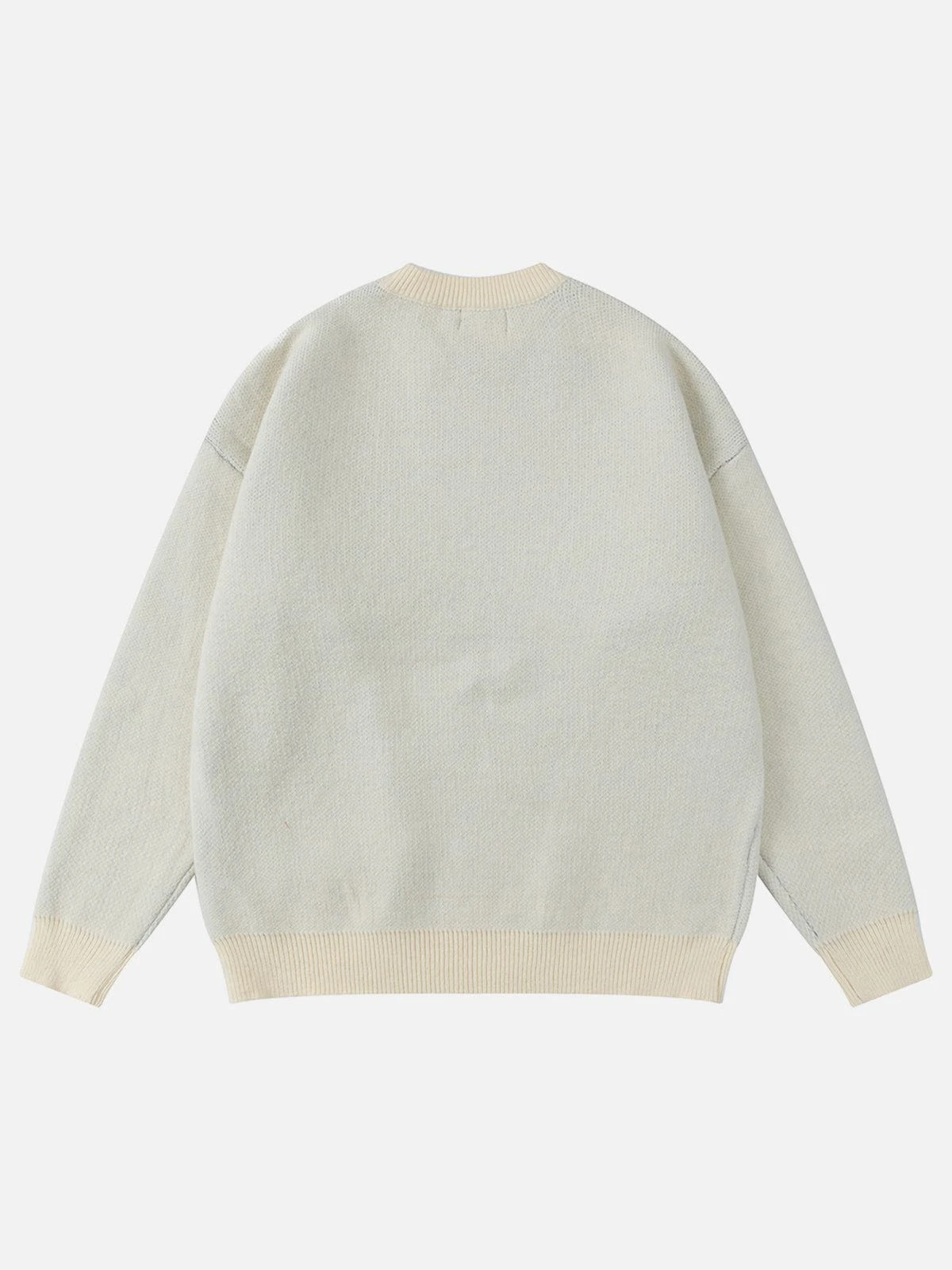 Demonstrate personal flair in this Fringe Letter Jacquard Sweater. This creation flaunts distressed fringes to display words and exudes unique character with its exceptional detail and uncompromising attitude.