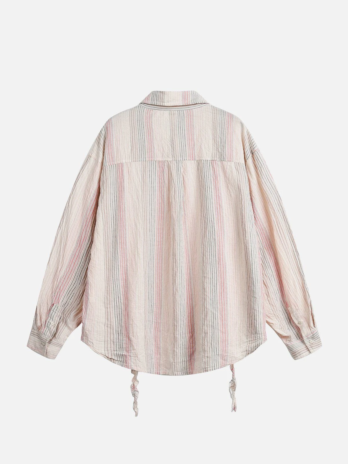 Elevate your style with our striped long-sleeve shirt featuring heart-shaped buttons, chic pleats, and a clever concealed button design. Delightfully playful yet effortlessly sophisticated.