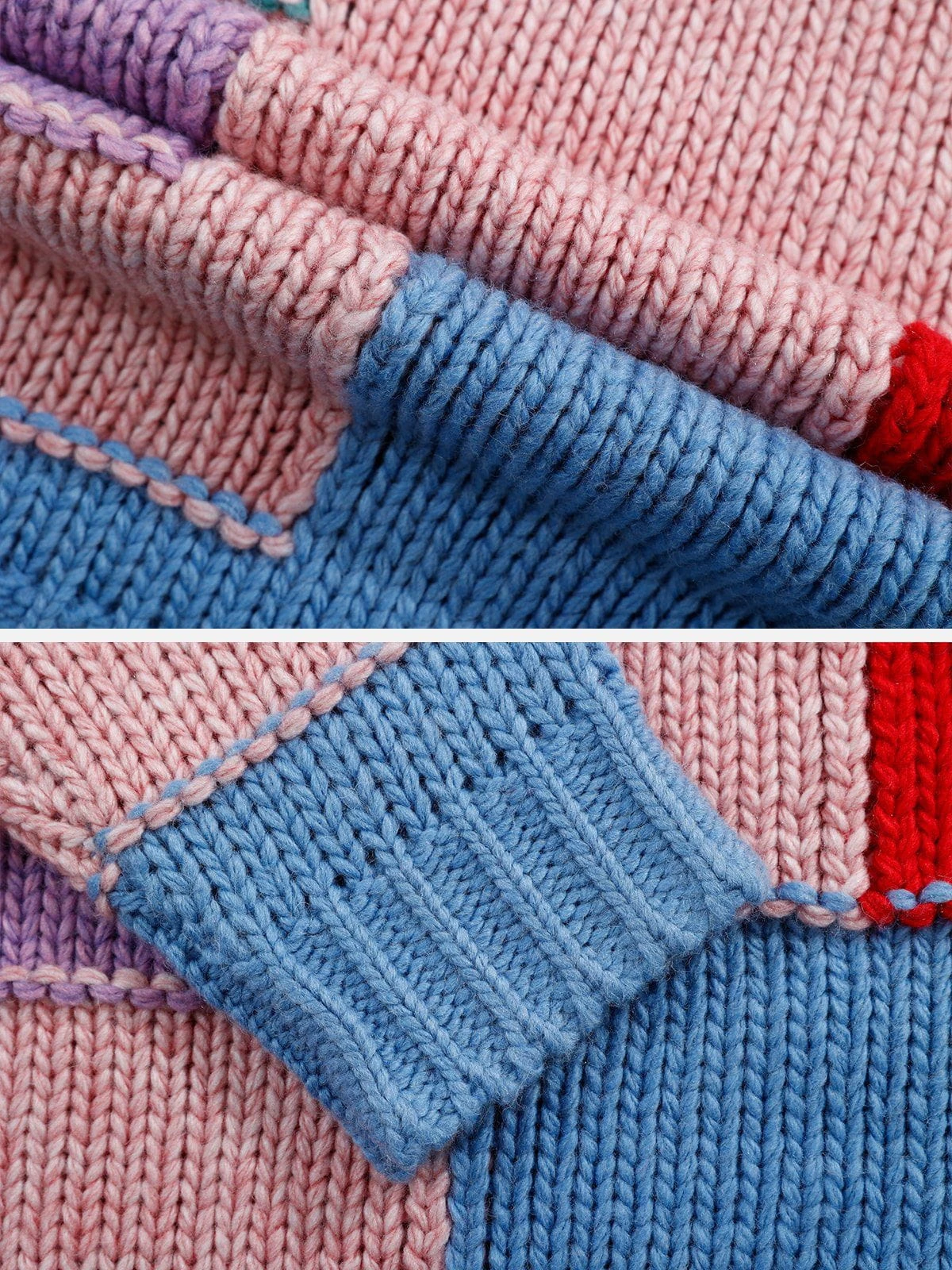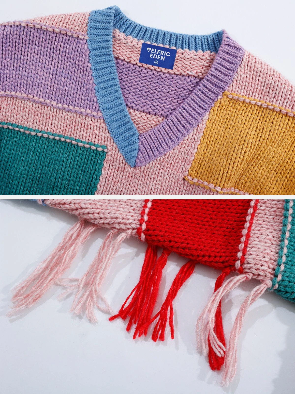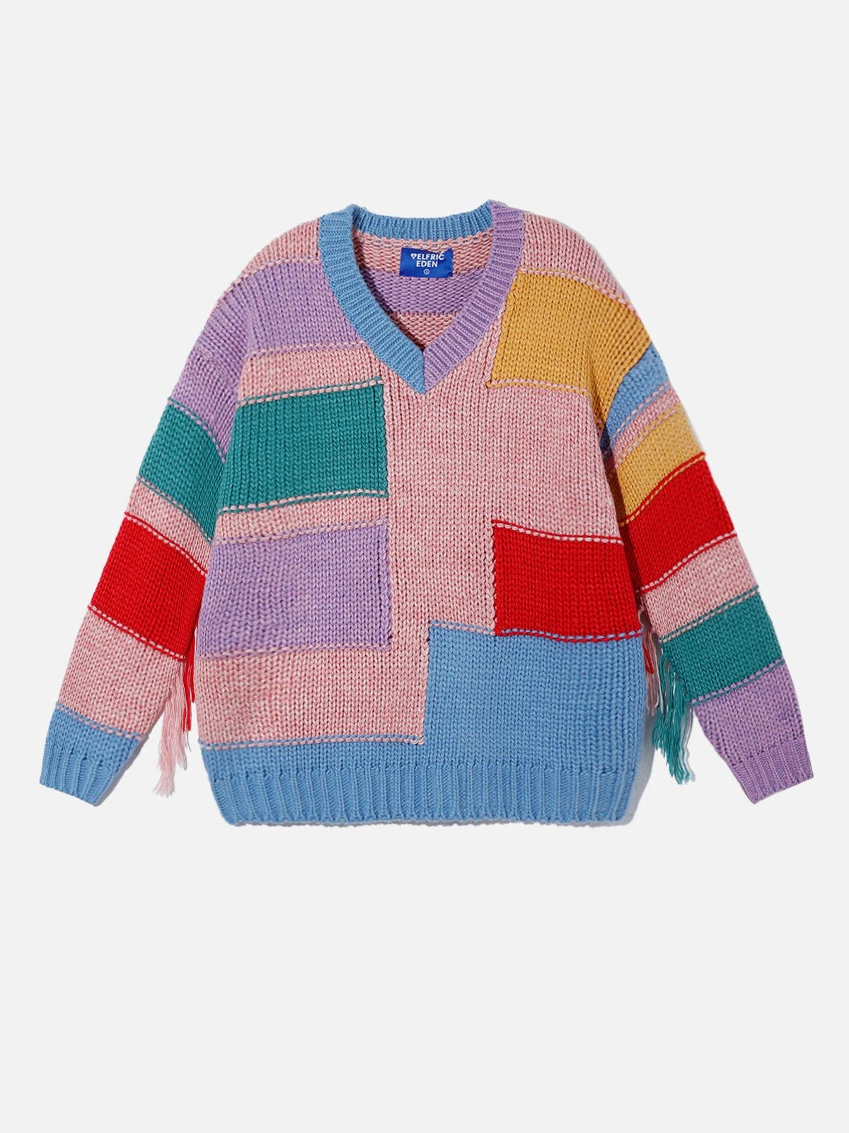 The irregular colorful patchwork design adds a touch of quirkiness and creativity to the overall look. With its V-neck design and relaxed fit, this sweater is versatile and suitable for various occasions. Whether you pair it with jeans for a casual look or dress it up with a skirt for a more sophisticated ensemble, it is sure to make you stand out from the crowd!