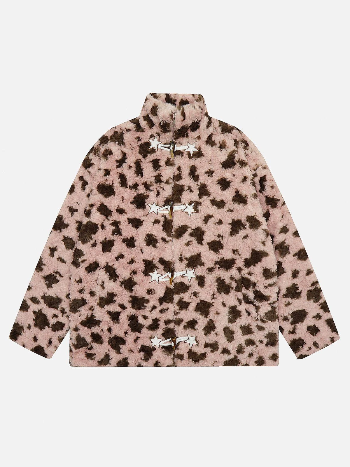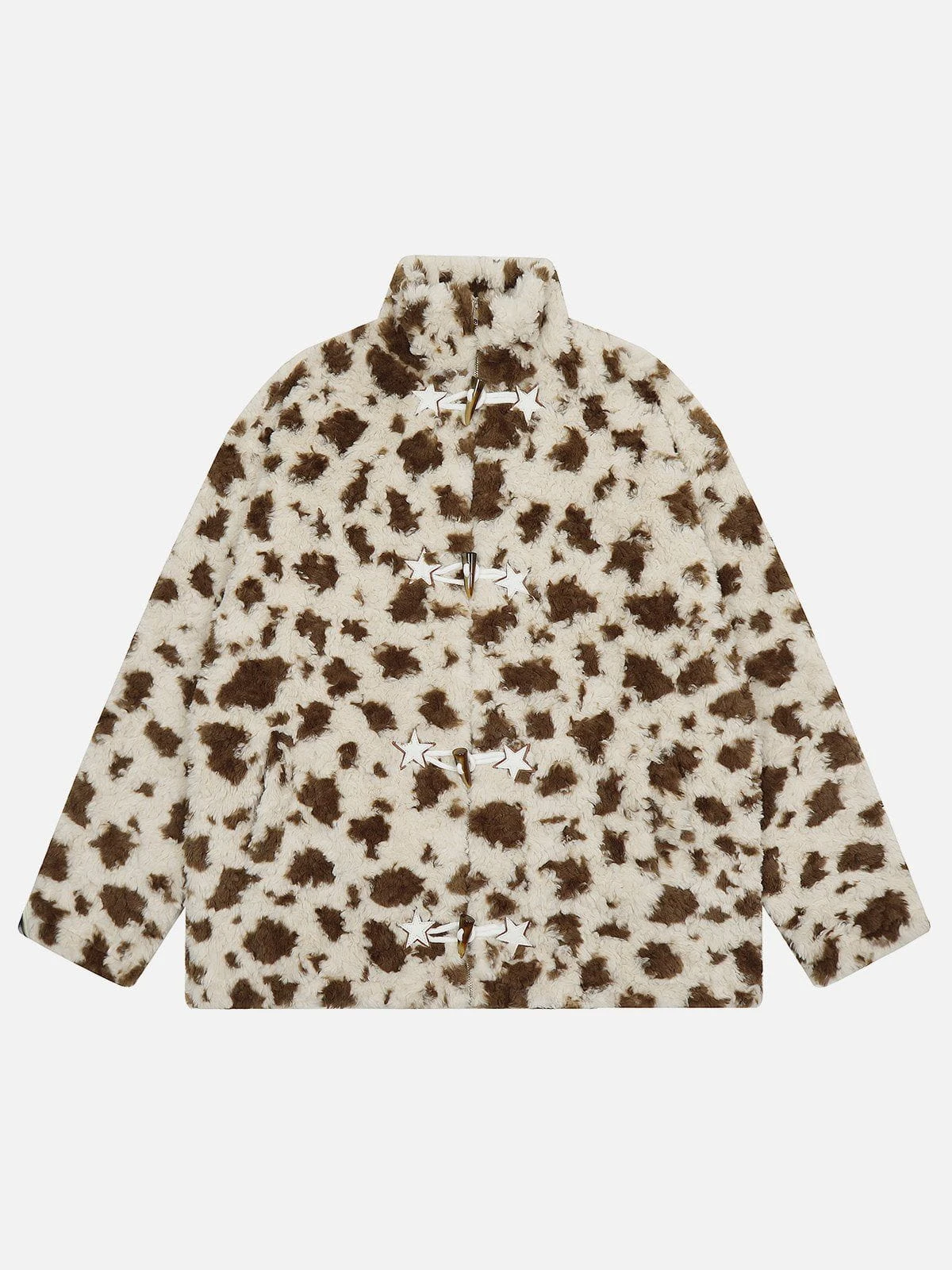 Wrap yourself in luxurious softness with our Aelfric Eden Leopard Star Button Sherpa Coat. Made with supple Sherpa material, this coat offers both comfort and style. Perfect for staying warm and fashionable during the colder months.Â