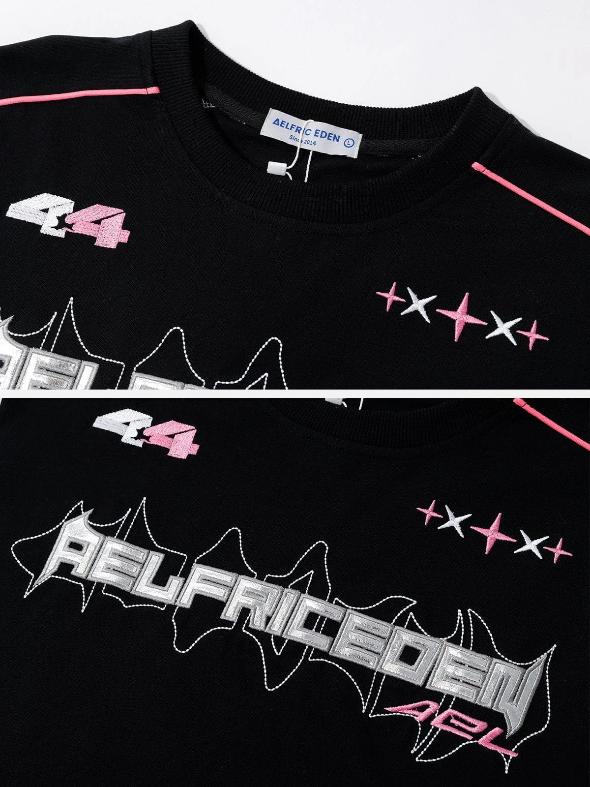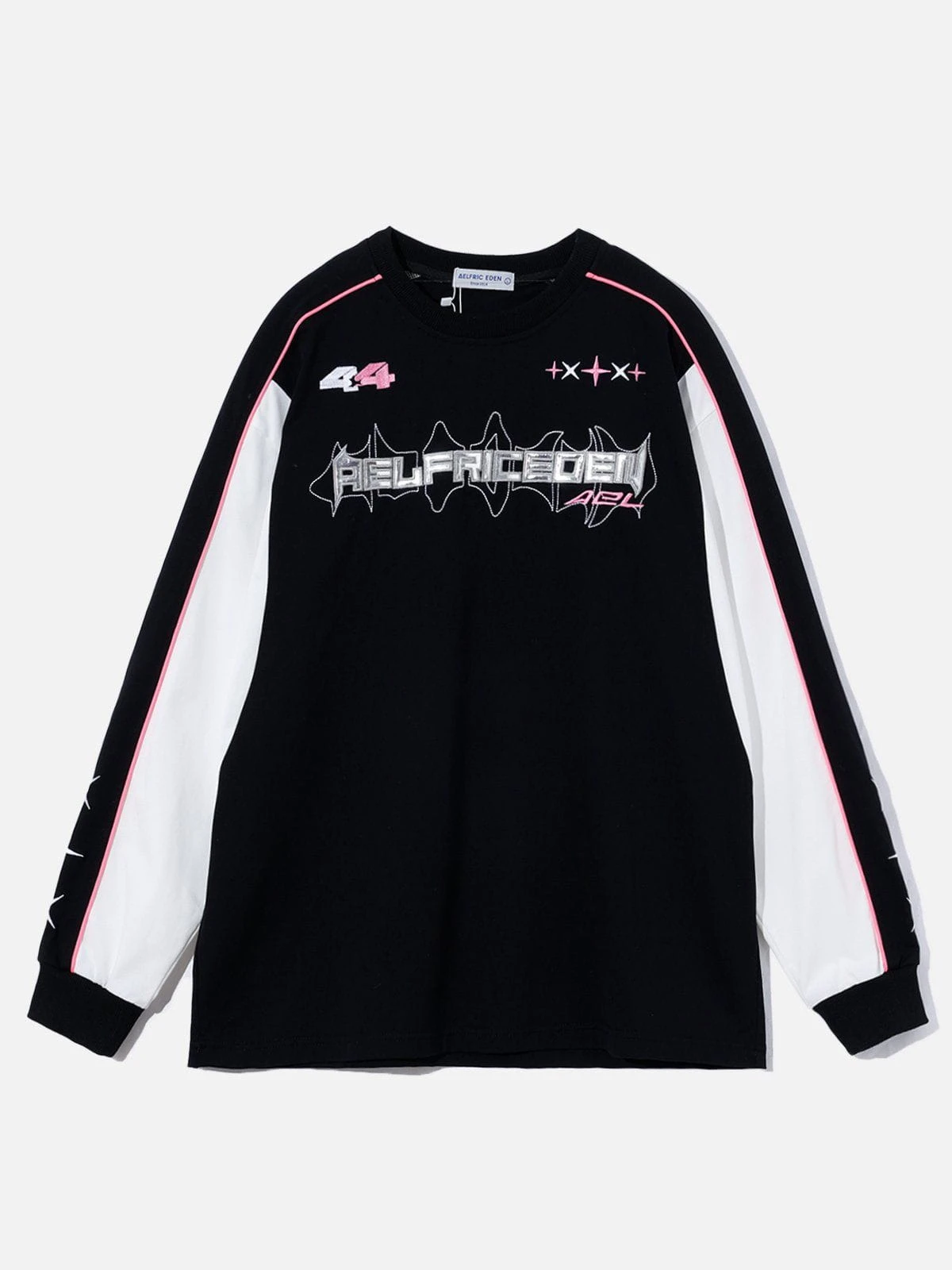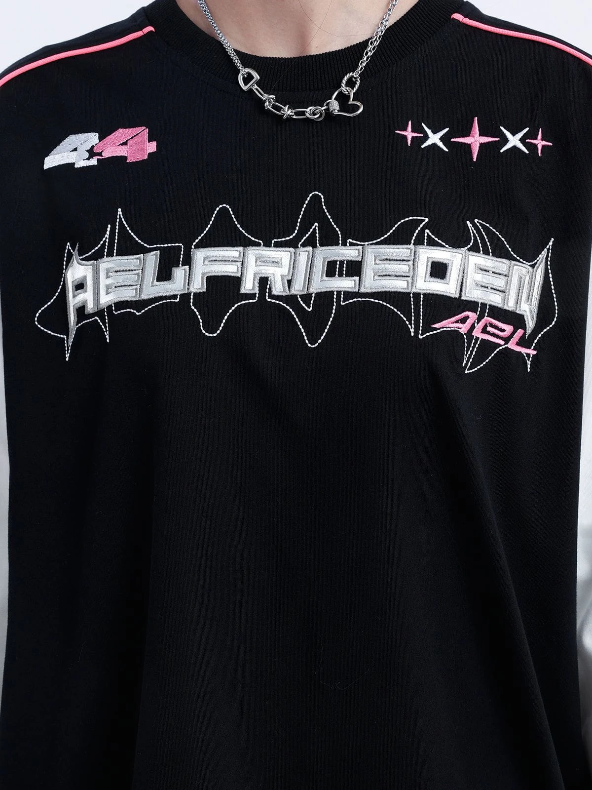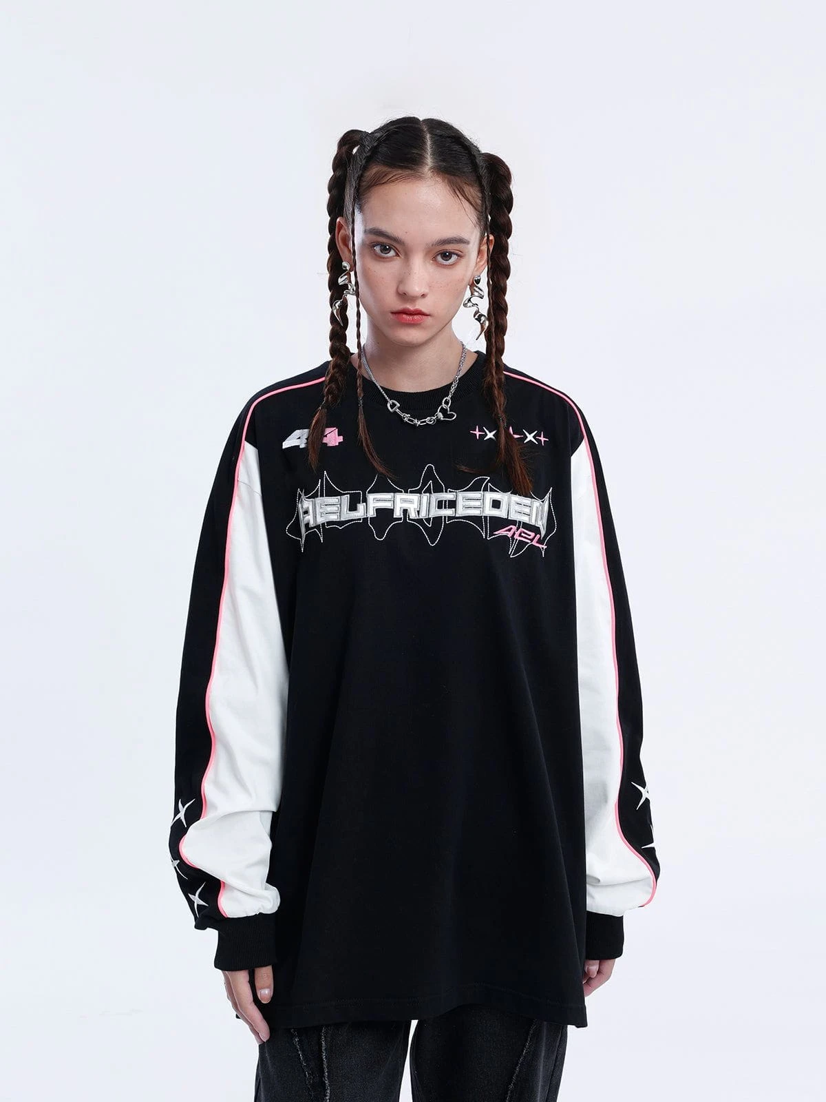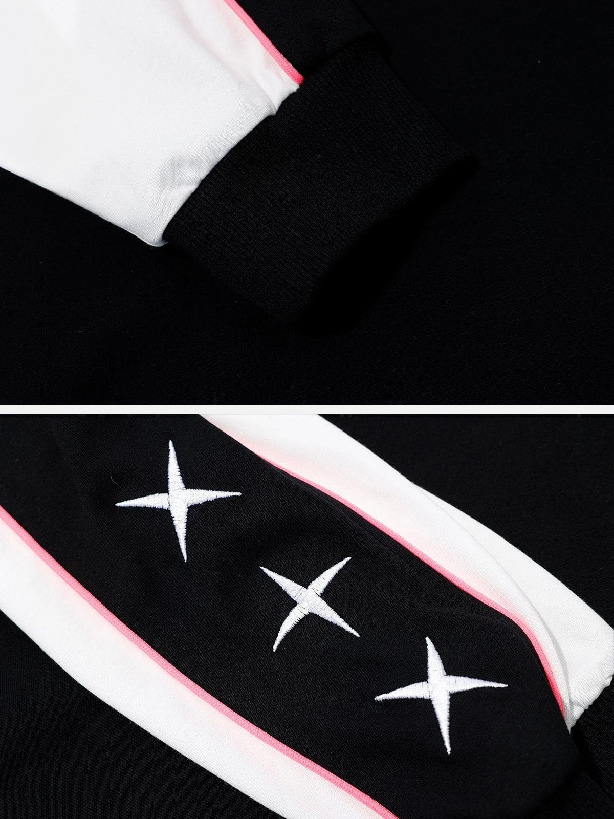 It cleverly combines a variety of design elements, and the black body shows a low-key and refined atmosphere. The sleeves feature a graphic patchwork of black and white, adding a modern contrast. One of the highlights is the fine embroidery on the chest, which resembles electric currents or dynamic lines. This adds eye-catching visual detail to the upper body, making it the center of attention.Â