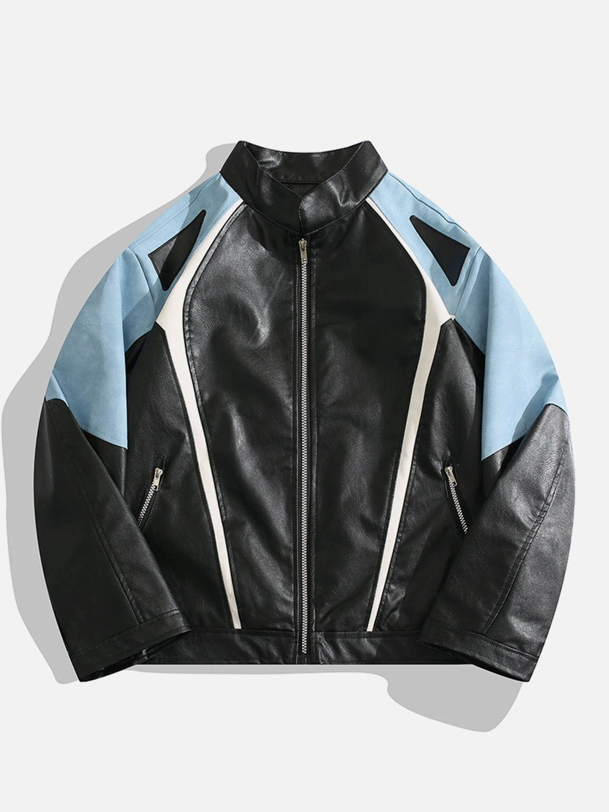 Clothing details: Patchwork, Slanted welt zipper pockets, Faux leather.