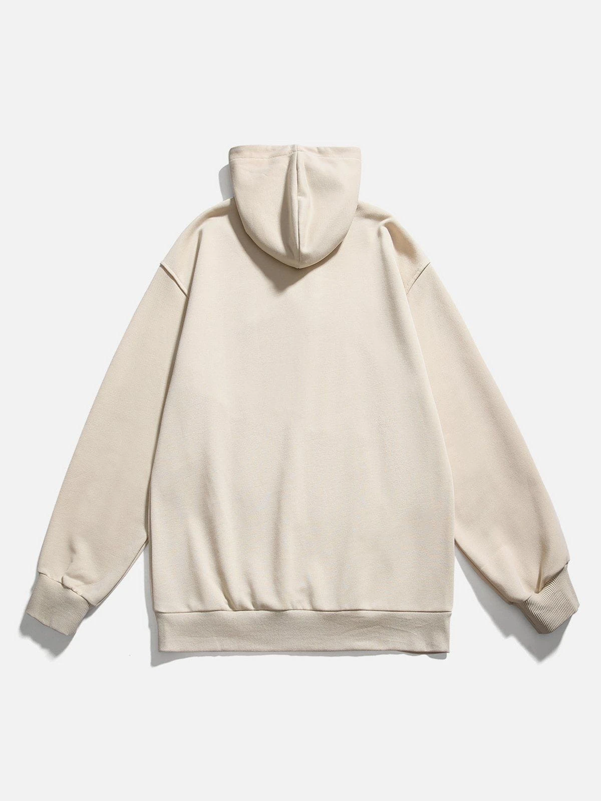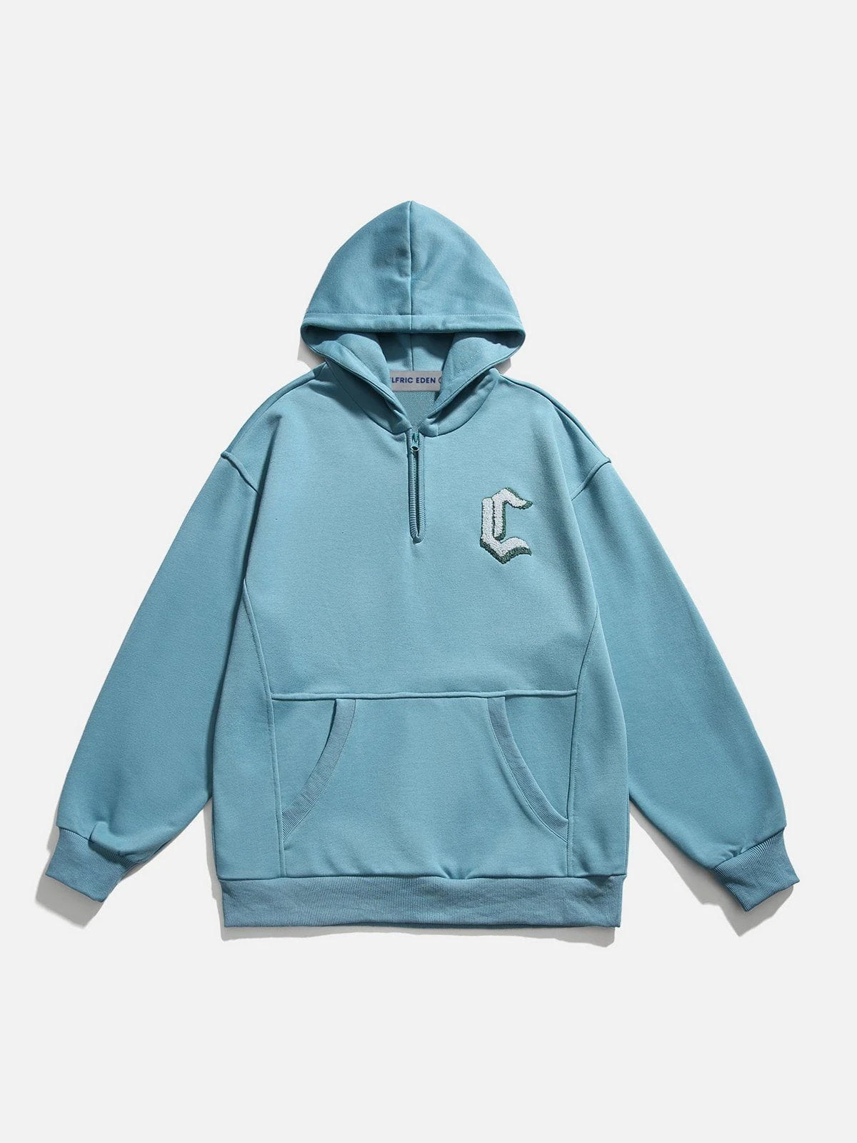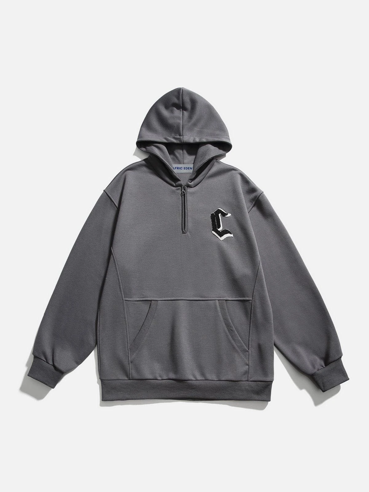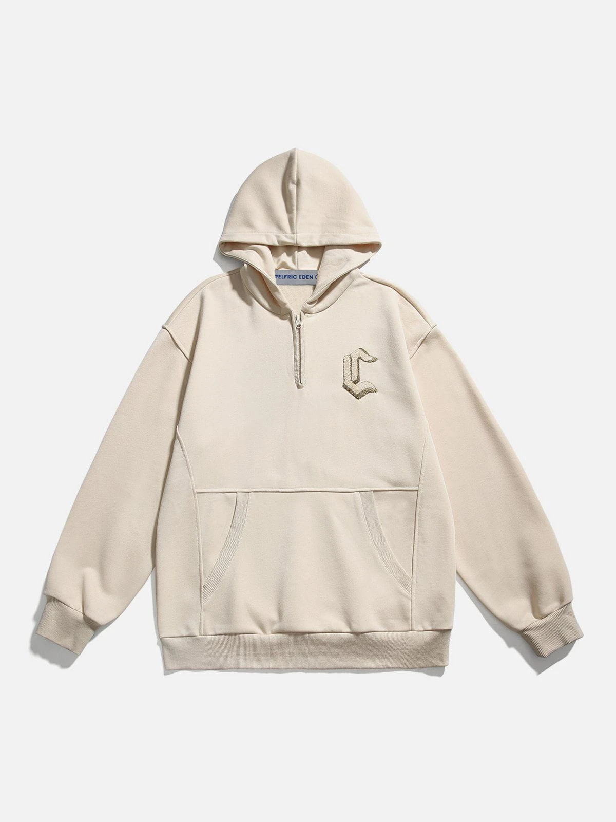This hoodie features a unique half-zip neckline, a sleek patchwork design, and a clean, solid-colored foundation with a subtle embroidered accent on the chest.