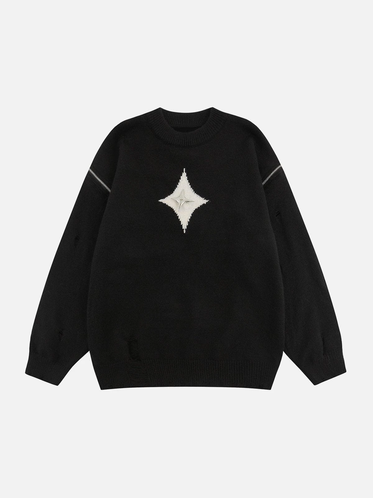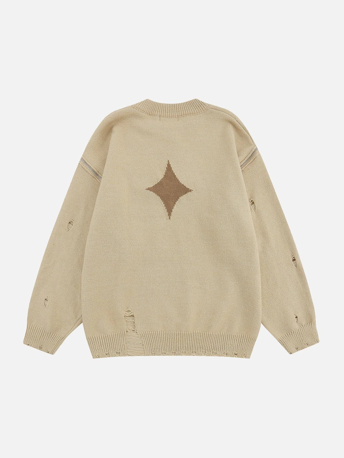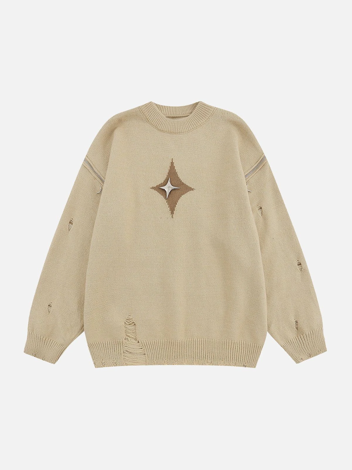 The center of the sweater features a prominent star pattern, with a shimmering metallic star at its core, and the sleeves are adorned with functional zippers, allowing you to create an off-shoulder style effortlessly, adding a hint of allure to your outfit.Â