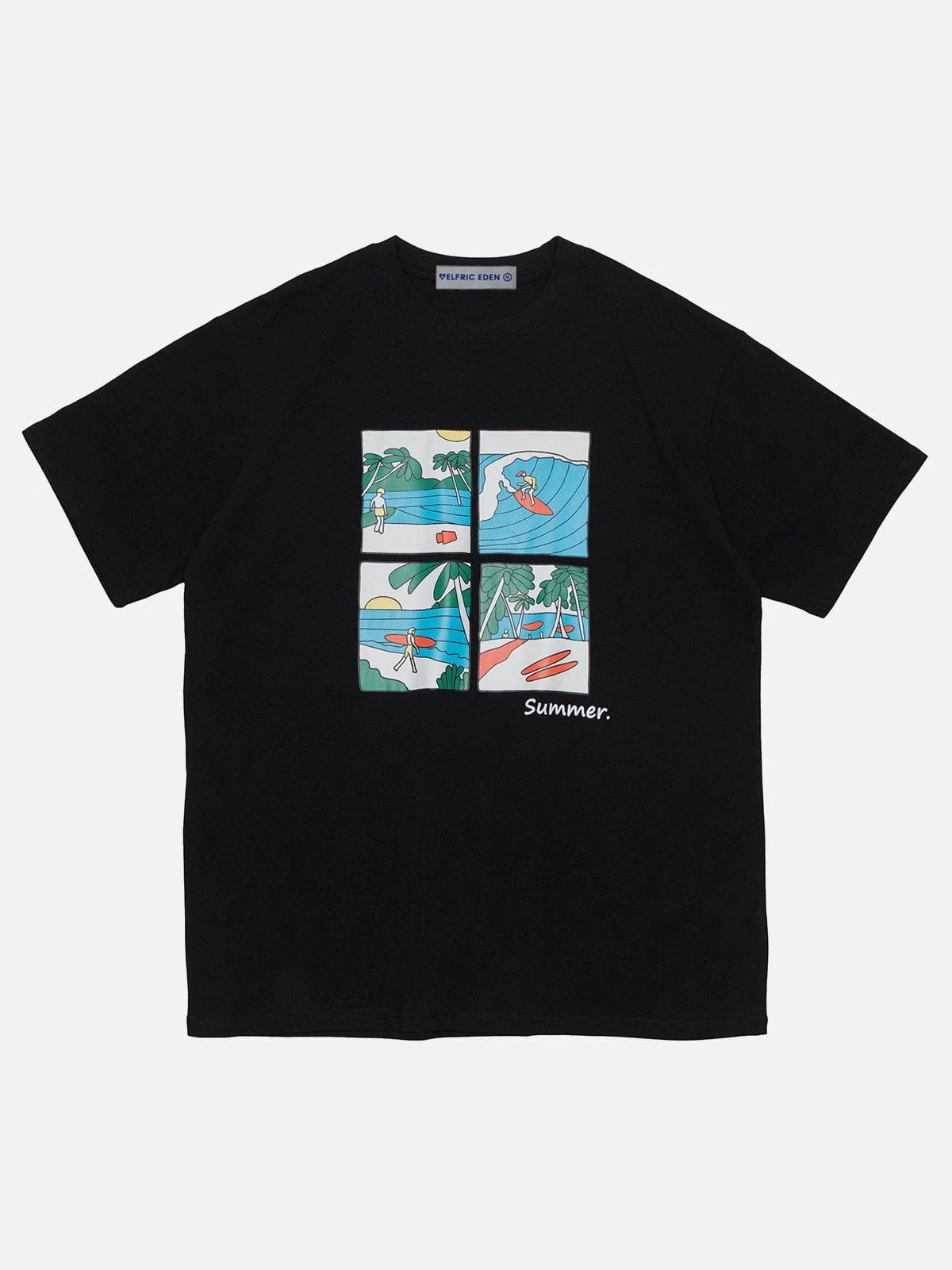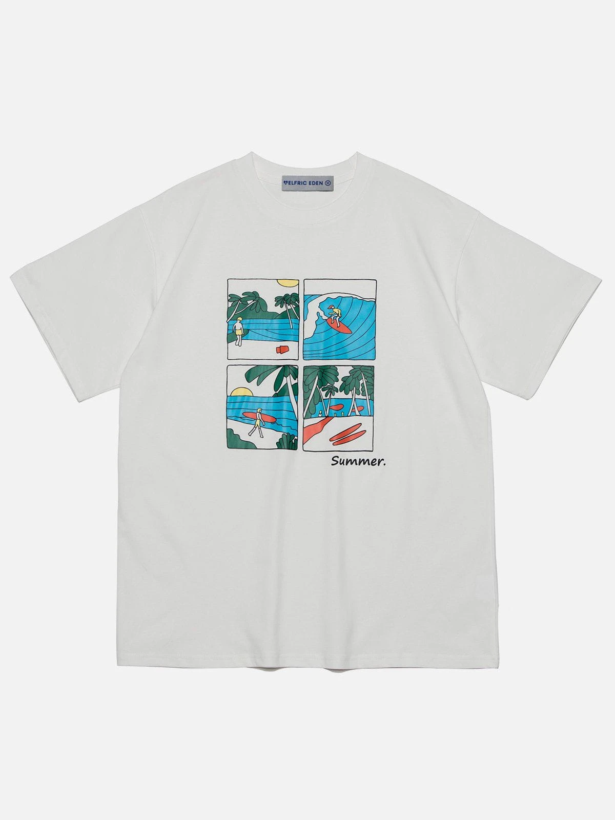 Surf’s up in our vibrant short-sleeve tee! Embrace the energetic vibes with playful surf cartoons, conquering waves in style. Dive into spring with this lively must-have.