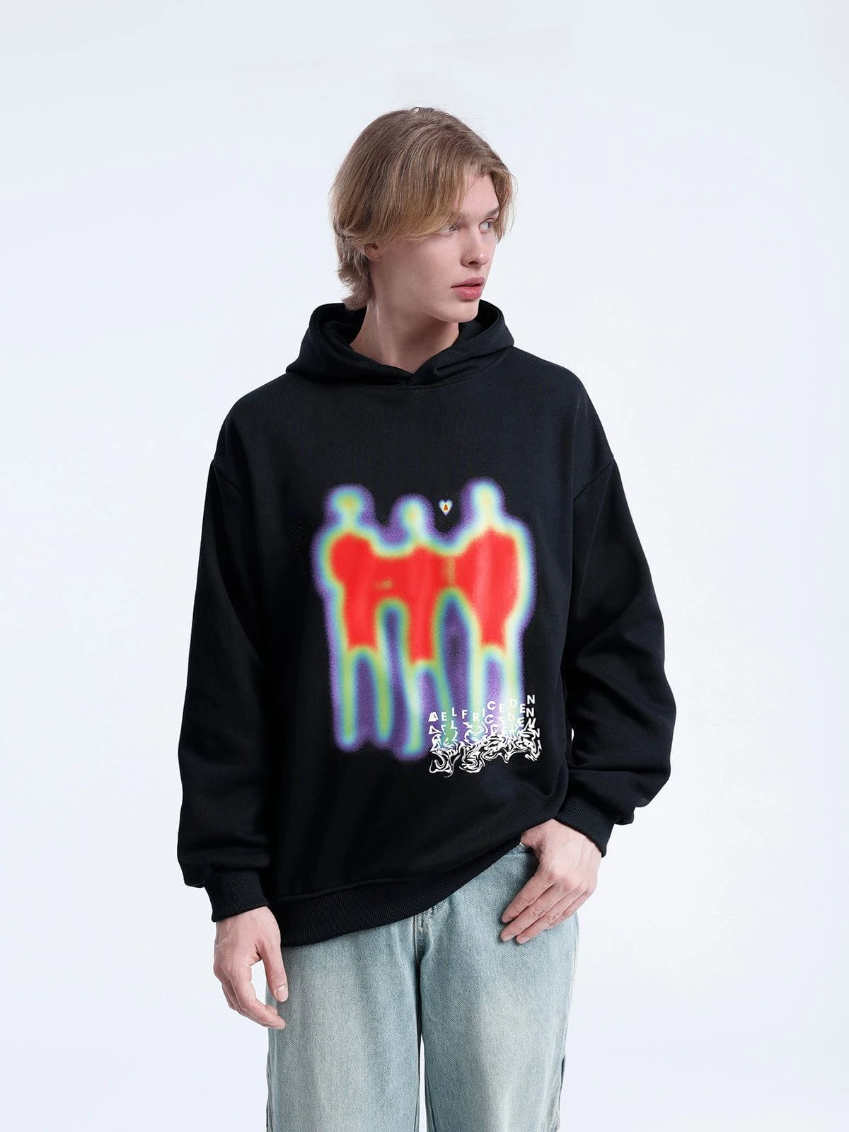 This hoodie features a captivating thermal imaging portrayal of a figure, seamlessly intertwined with our brand logo. Crafted from high-quality fabric, this hoodie ensures both comfort and style.