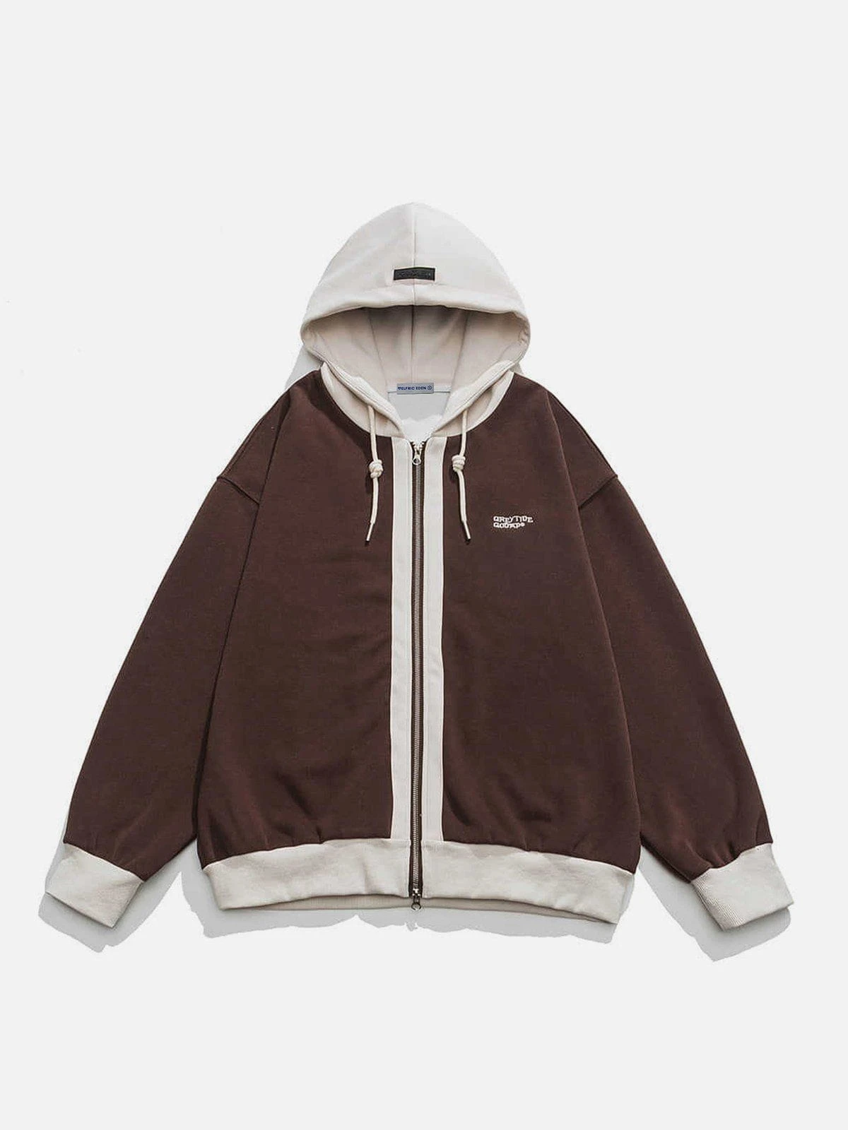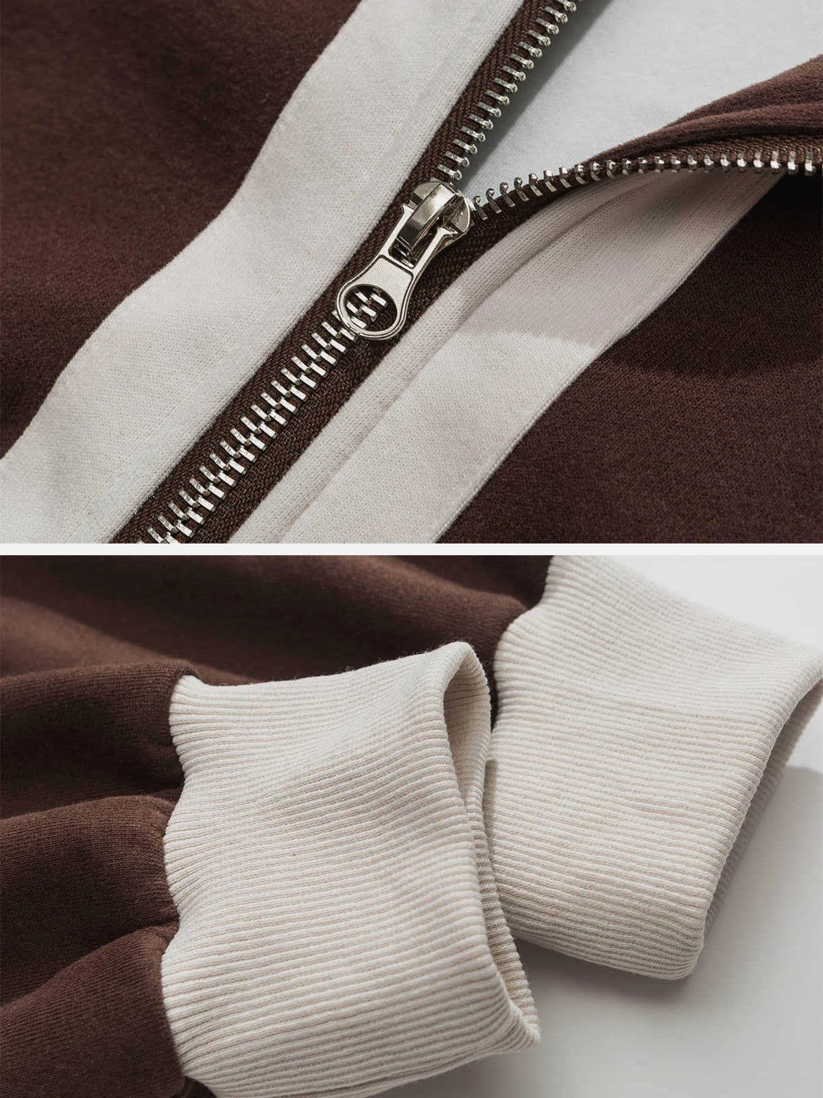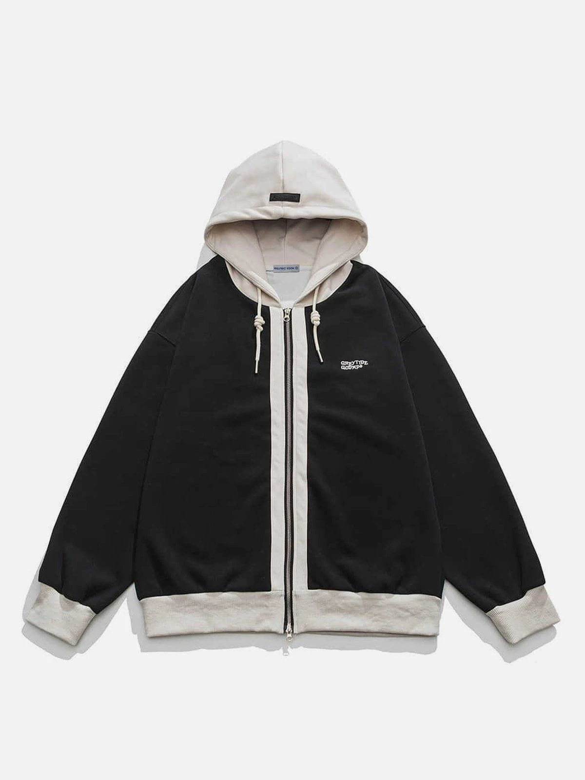 Features a unique double zipper design, allowing for versatile layering options and adding a modern touch. The simple yet eye-catching color-blocked panels create a harmonious contrast.