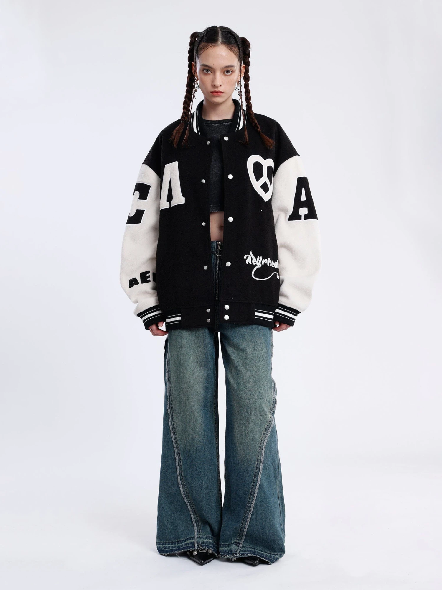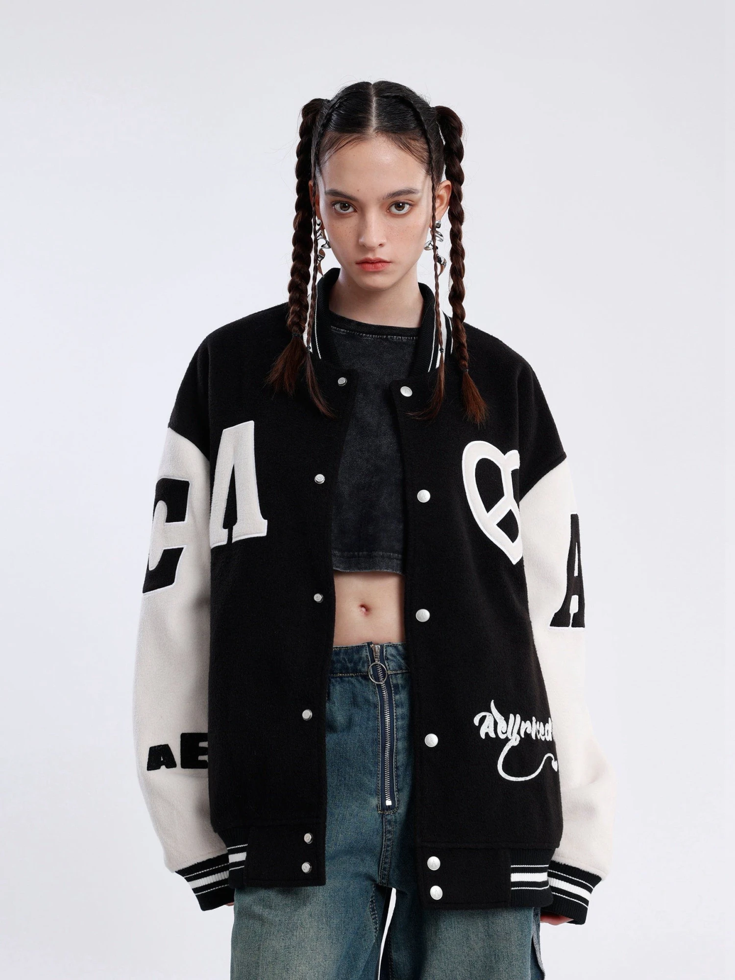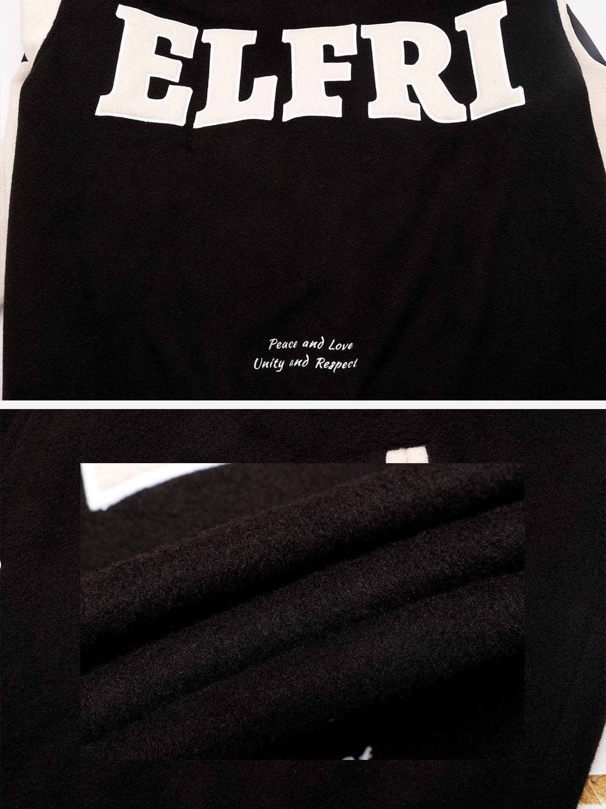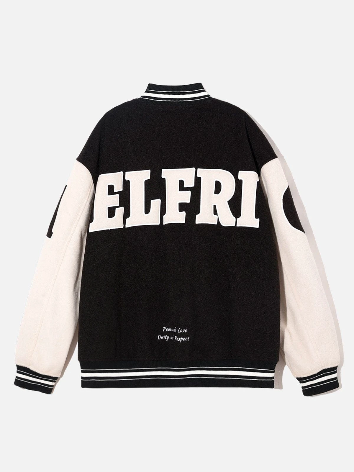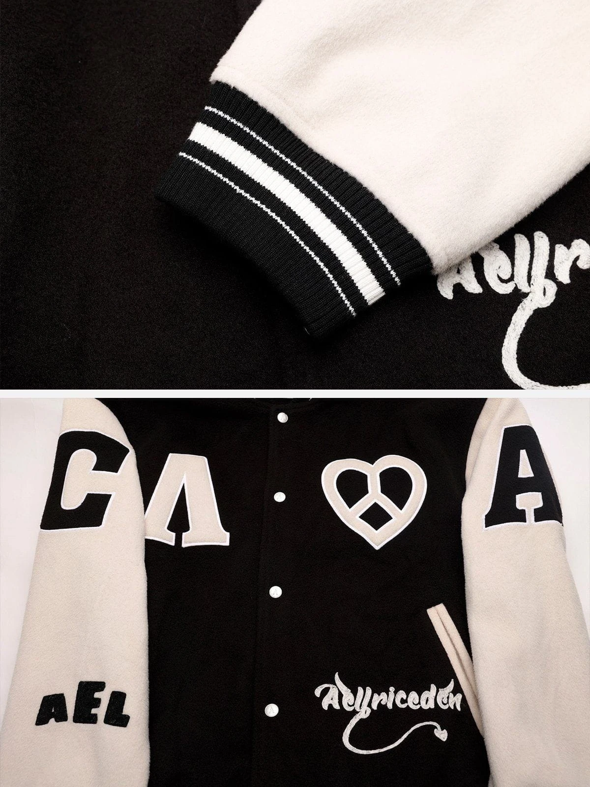 This varsity jacket adopts classic black and white tones, which is highly versatile and timeless. In addition, we pay attention to details, and through the use of appliqué embroidery technology, the pattern is full of three-dimensional and unforgettable.