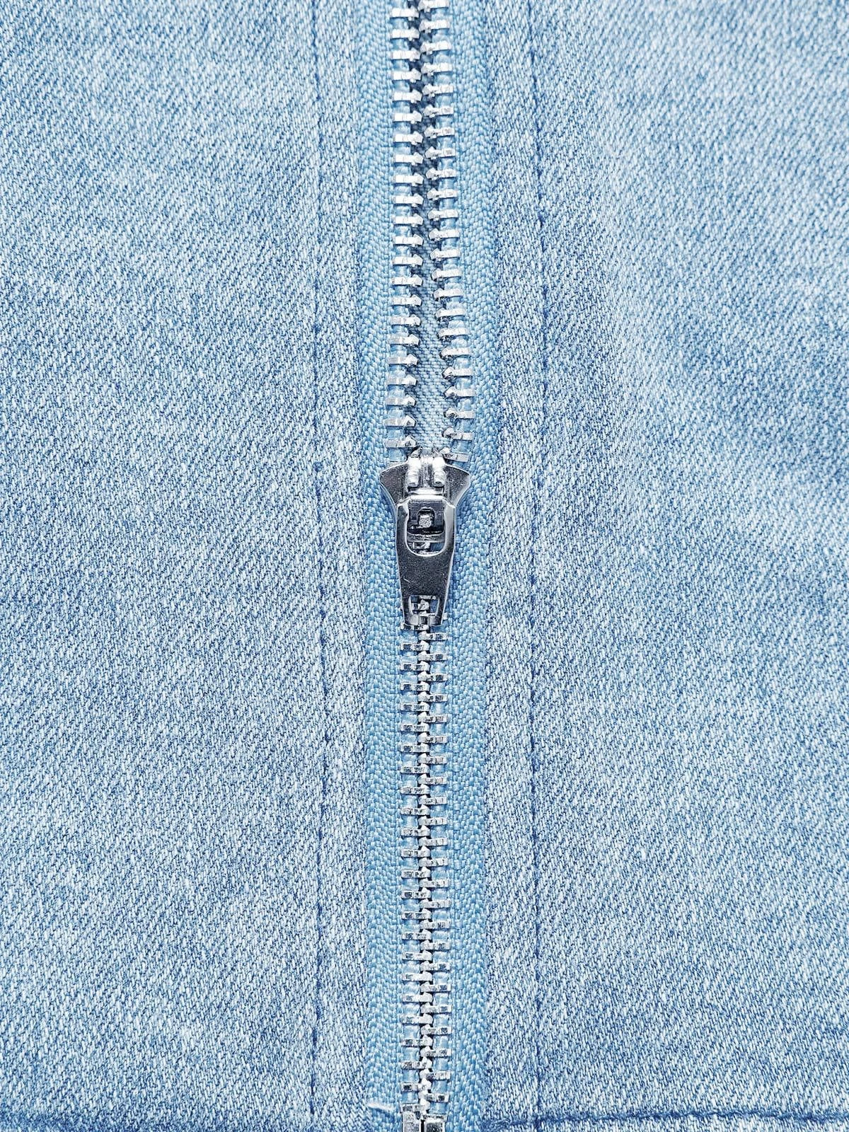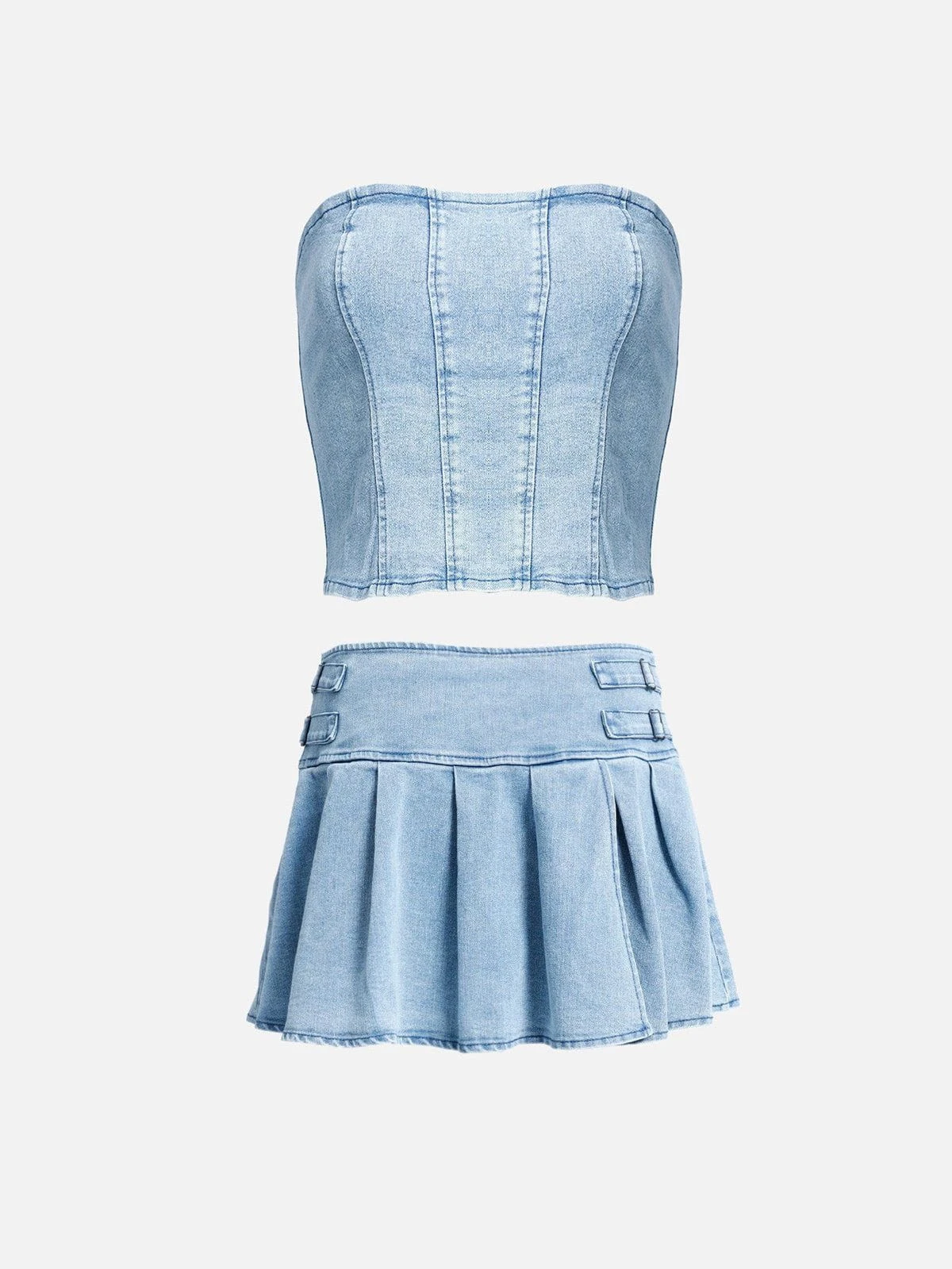 Unleash a blend of sexy, sweet, and cool styles with this two-piece denim tube top and skirt suit. Perfect for crafting a youthful and edgy look, the backless zipper design and skirt slit effortlessly highlight your figure curves, making a bold statement in fashion.
