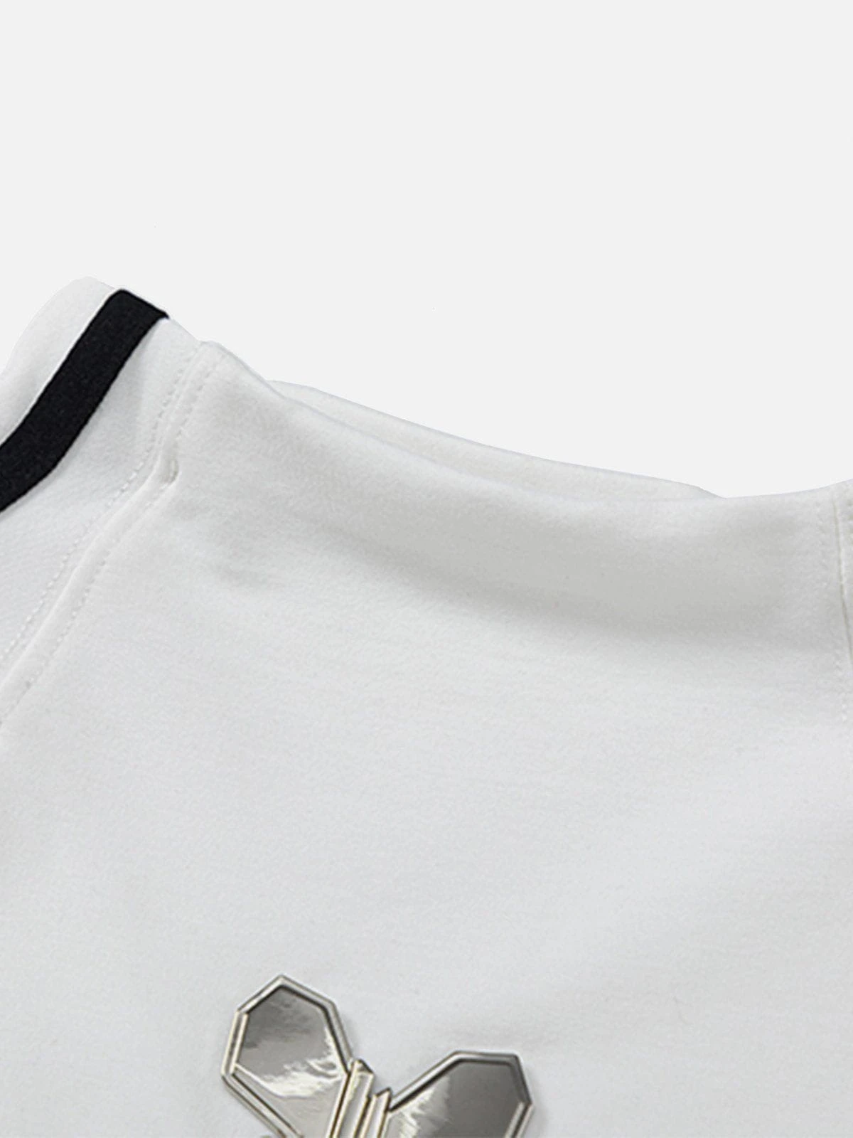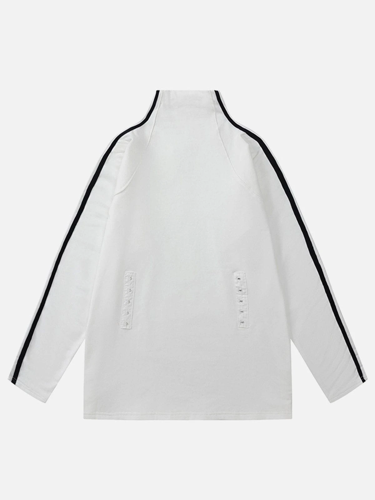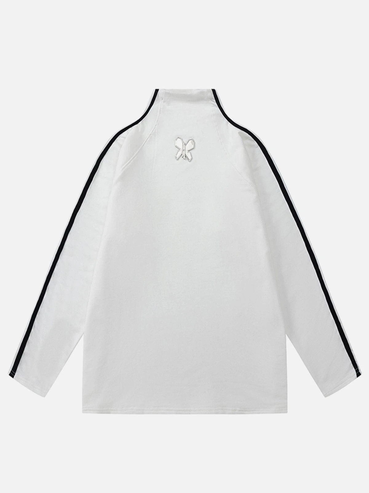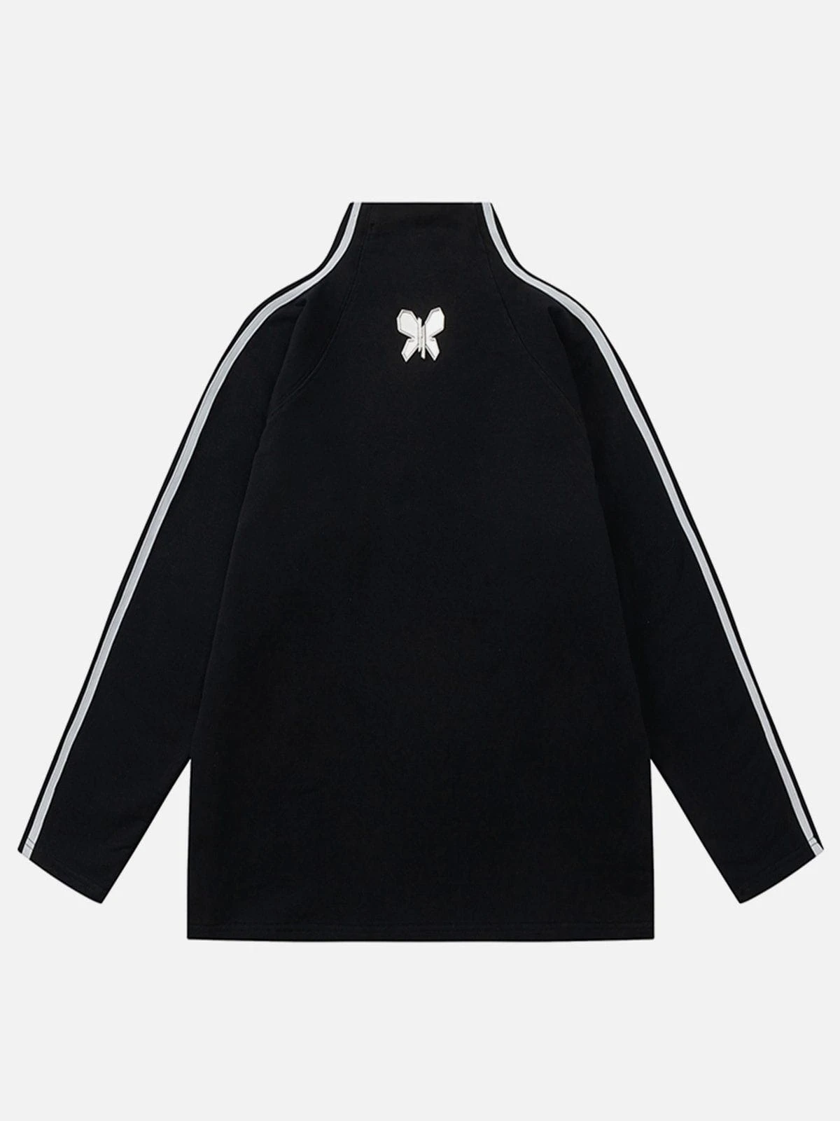 This sweatshirt, with its half-collar design, showcases a subtle butterfly emblem and stylish black and white striped sleeves. The attention to detail enhances your perfect shoulder-to-neck proportions, completing the overall stylish look. 🦋🖤