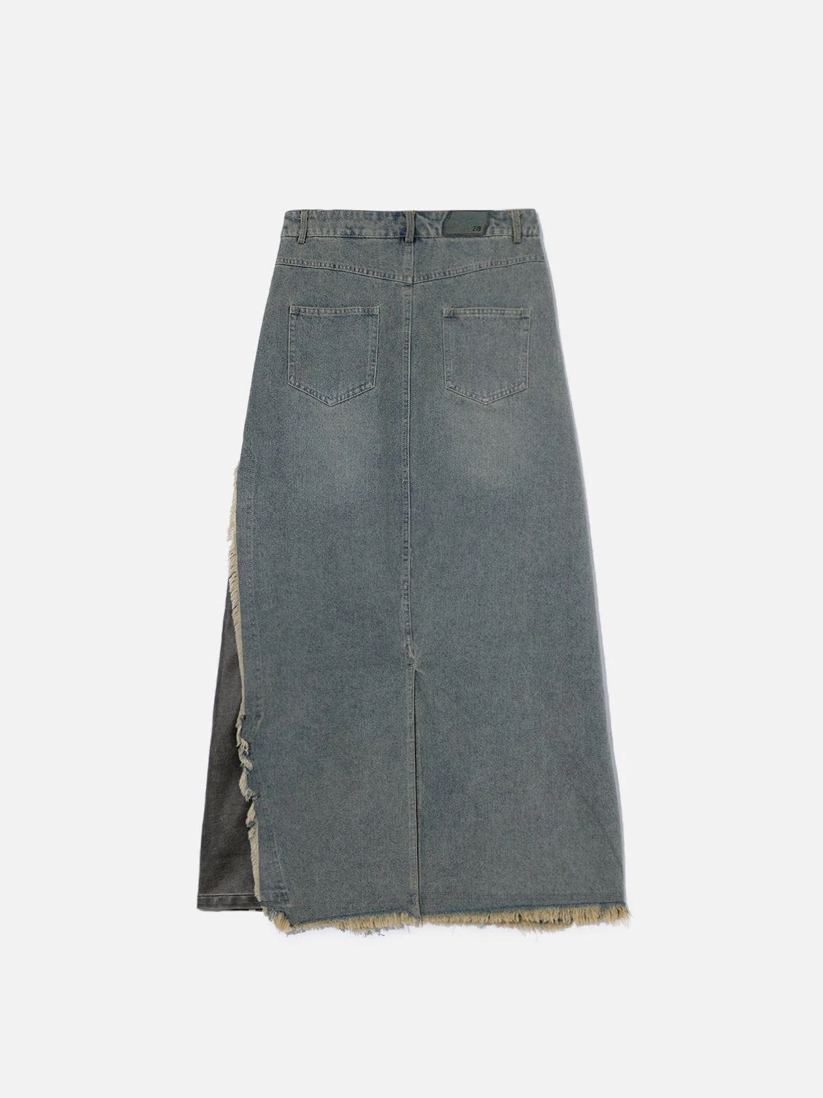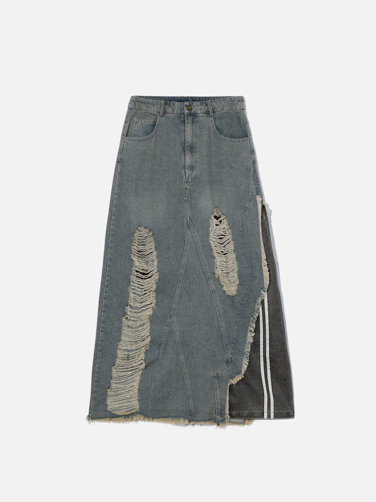 This denim skirt boasts a long silhouette with vintage-inspired eyelets. Contrasting stripes inject a modern touch into this timeless piece, making it a unique addition to elevate your style.